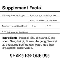 Huan qi (Astragalus propinquus), Shu di huang (Rehmannia glutinosa), Dang shen (Codonopsis pilosula), Sang bai pi (Morus alba), Zi wan (Aster tartaricus), Jie geng (Platycodon grandifloris), Wu wei zi (Shisandra chinensis), structured purified rain water, less than 3% alcohol preservative. No other ingredients added.