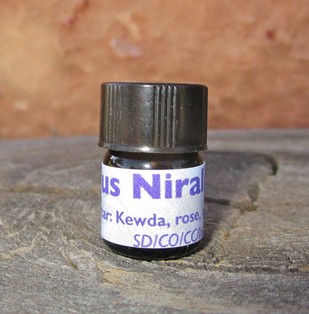 The beautiful traditional khus nirali attar, is made from the flowers of rose and kewda.  Its aromatic profile is complex, with a high honeyed floral top note, gently tempered with a warm, sweet rosy bouquet surrounded by the rich, sweet, earthy and mossy notes of ambrette and vetiver.